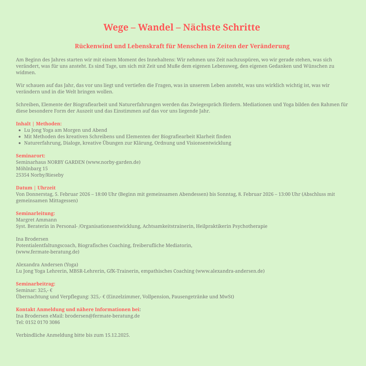 Veranstalterin: Ina Brodersen, brodersen@fermate-beratung.de, Mobilnummer 0152 0170 3086